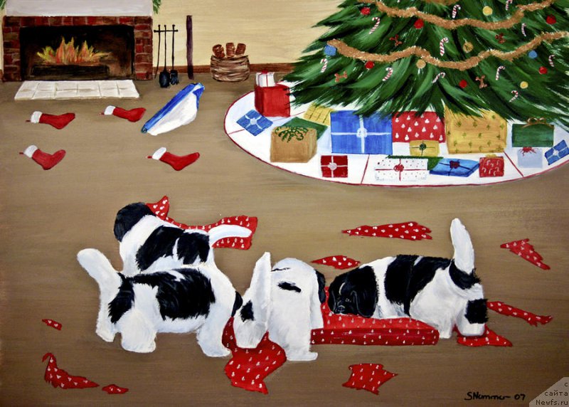 Автор http://www.canineartwork.com/prints_newfoundlands.html ЗЫ: опубликовано по просьбе выбравшей лимит сообщений Аллы. Спасибо большое ей за такой нужный всем нам труд по поиску и демонстрации нам таких красивостей :). Alla и Бенина мать спасибо огромное - очаровательные попастики, очень занятые разбором подарков :)! Такая праздничная новогодняя замечательная картинка :)))!!