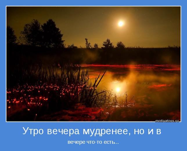 (Взято отсюда) 14 ноября - День общения с духом вечера. Для каждого духа есть особый ритуал вызывания. Дух вечера приходит в сумраке и покое, когда стол накрыт скатертью с шелковыми кистями, а на нем дымится чашка с чаем и лежит колода потрепанных карт. И тогда можно начать с ним долгую, интригующую беседу. - Добрый вечер! Хорошо ли поживаешь? - Прекрасно, просто восхитительно! Вечер придвинет к себе чашку и примется тасовать колоду: - У тебя был такой интересный день, расскажи мне! - попросит он, вытягивая ноги и складывая их одна на другую. И завяжется тихий и личный разговор. ![]() Утро только началось, а с духом вечера уже хочется общаться прямо сейчас..."в сумраке и покое, когда стол накрыт скатертью с шелковыми кистями, а на нем дымится чашка с чаем и лежит колода потрепанных карт" (с).... а не идти на работу...