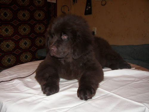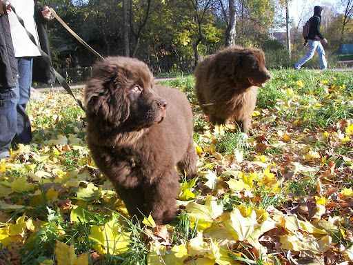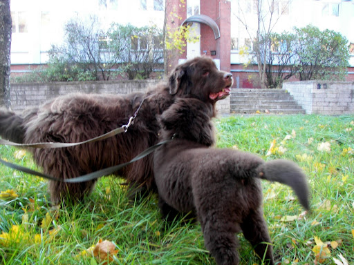 В понедельник,18.10.10.,сразу почле смены, поехала к УРА с Таней.Договорились,что они встретят меня на остановке.Подьезжая ,увидела что Таня с Ура переходят дорогу. Изумление №раз.. Я конечно ожидала,что УРА подрос,но что бы до такой степени... Я тихо охнула-едрён батон-,но видно мне это только показалось что тихо,т.к. стоящая рядом тётенька опасливо посторонилась... Изумление №два... Те не многие пассажиры,что были в автобусе развернулись в сторону, переходящих дорогу, УРА с Таней.И я видела-эта пара их впечатлила.А мне захотелось в полный голос сообщить всем, что это мои друзья идут,что это мой юный дружочек идёт меня встречать. Отступление... Я беззащитна перед обоянием ньюфосущности.Не ждите от меня обьективности... Сидя у ног Тани, УРА внимательно разглядывал выходящих людей.Мне стоило не мало сил,что бы сдержаться и не заорать-УРА,СОЛНЦЕ МОЁ,ПРИВЕТ!!! Ё моё,ребята,ОН меня УЗНАЛ!Мы с Ура обнюхались,обслюнявились,обнялись...И это шоколадное чудо загарцевало вокруг меня -О.тётка НИЗЗЯ приехала...Оооо,вы только посмотрите, у неё на холке шерсть выросла!!(У меня капюшон меховой)Может она скоро превратится в НЬЮФКУ!? Но Таня пресекла наши нежные излияния и мы пошли на писательную поляну. Всем привет! Улучила минутку передать привет от наших родственников: